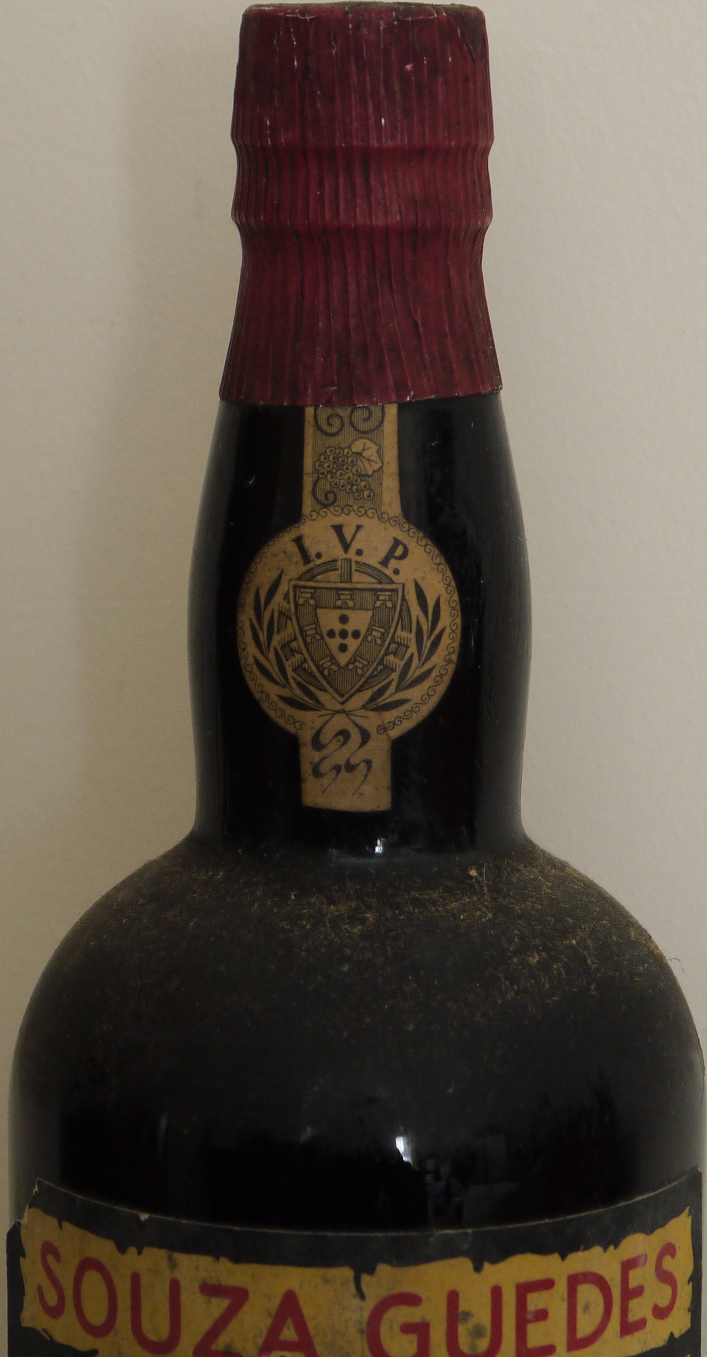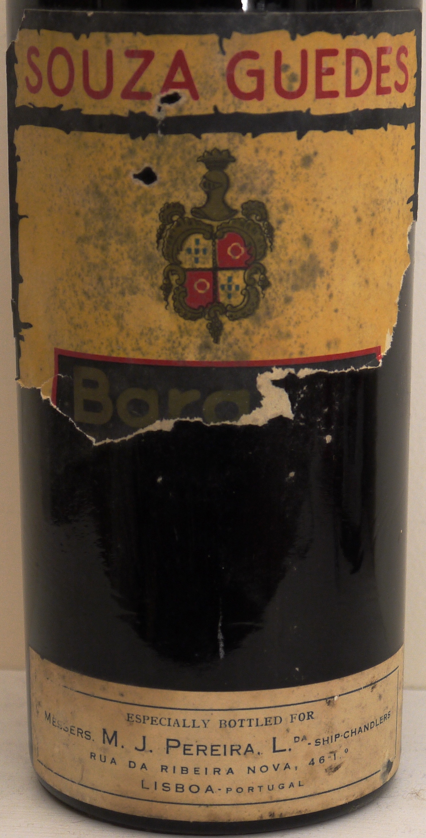 From the torn label the following text is available" Souza Guedes" "Bara......(label torn here)" "Especially bottled for Messers. M.J.Pereira.L.DA. Ship Chandlers. Rua da Ribeira Nova. 46-1 Lisboa Portugal." Seal at neck: "Vinho do Porto. Selo de Garantia. T 682845"
